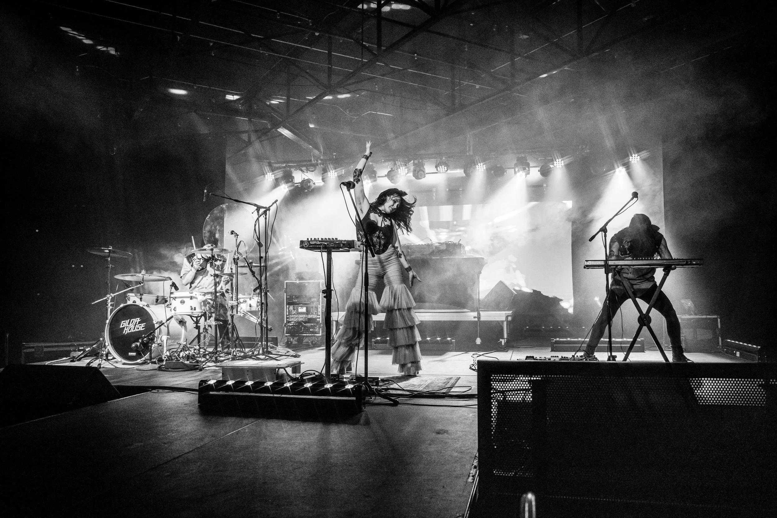 GILDA HOUSE features Meg Gildehaus on vocals and bass synth, Tony Morales on guitar, keys, and background vocals, Nick Miles on drums and lighting design, and Sean Lynch writing in the studio and mixing the band live. Meg came from a heavy gigging bar band background playing violin and singing. Enthralled with writing and producing on a computer, she started this project in 2019 with a laptop, microphone, and a Scarlett 2i2 at home. Coming from an instrumental metal background, Tony Morales expanded the sound and possibilities with guitar, keys, and back-up vocals. Nick Miles is a punk drummer at heart bringing heightened energy, punch, and groove to the stage and the studio. Nick also creates the lighting design for the live show. Sean Lynch is a longtime Billings scene builder as a musician, promoter, producer, and venue owner. He became a writing partner in the studio and now manages, writes with, and mixes the band live.